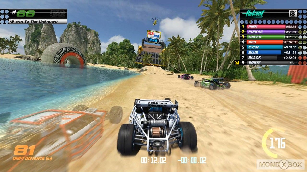 Anche la componente multiplayer ha una sua importanza del gioco, forse più che mai vista la mole di modalità presenti. Le classifiche dei tempi singoli vengono qui affiancate da una valanga di variazioni del gameplay, sia online che in locale: sulla stessa console si può sfruttare lo split-screen ma anche la modalità hot seat, dove molti giocatori possono alternarsi anche con un solo controller nel tentativo di battersi i tempi a vicenda. Qualora si vada online invece, si apre tutto un altro mondo: possiamo collegarci ad altri giocatori decidendo se gareggiare in contemporanea in una classica gara (senza collisioni, però), oppure con un limite di tempo entro il quale ognuno deve cercare di fare il tempo migliore, simile a una qualificazione insomma. A questo si aggiungono una serie di variazioni (alcune delle quali in modalità segrete sbloccabili con dei codici, cosa che ben si sposa col feeling arcade del titolo), che per esempio possono aggiungere la possibilità di fare acrobazie come rotazioni o derapate per ottenere del turbo da spendere nel corso della gara.