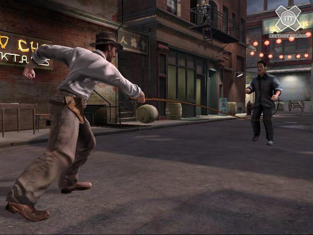 Certo, nel gioco alcune animazioni prededefinite verranno implementate (ad esempio per le cut-scenes), ma saranno la minoranza rispetto ai movimenti calcolati in real time. Anche gli ambienti saranno decisamente interattivi: ogni zona in Indiana Jones 2007 è completamente distruggibile. La tecnologia che rende possibile tutto questo è chiamata Digital Molecular Matter, ed è stata sviluppata dalla Pixelux Entertainment. Ci sarà più di un’occasione nel gioco per sfruttare gli oggetti a disposizione in modo da uccidere i nemici in maniere innovative e inaspettate. Un esempio mostrato è stato quello di far rotolare dei barili di dinamite e farli esplodere sotto una scala antincendio. Il personaggio sopra quella scala è stato sbalzato via dall’onda d’urto e, anche se ha cercato di aggrapparsi alla ringhiera alla fine è caduto al suolo.