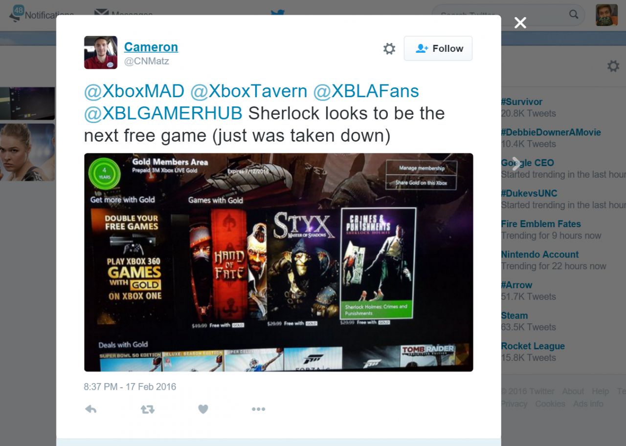 Secondo un' immagine spuntata su un tweet, Sherlock Holmes: Crimes & Punishments potrebbe essere uno di Games With Gold di marzo. L'immagine potrebbe essere comunque stata contraffatta con l'utilizzo di Photoshop, quindi non vi è nulla di ufficiale in questo momento. Entro la prossima settimana o giù di lì dovremmo ricevere la scaletta ufficiale dal blog di Major Nelson e potremo capirne di più.