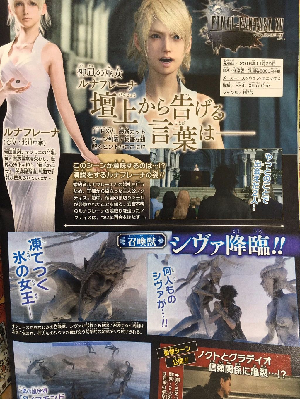 Dallo scan visibile in calce è possibile notare la storica divinità del ghiaccio Shiva - accompagnata da diverse copie di sè - in azione tra fiocchi di neve e venti gelidi attorno al protagonista Noctis, pronta a sferrare il colpo finale noto come "Polvere di diamante". Protagonista degli scatti è inoltre la gelida fidanzata di Noctis, Lunafreya di Tenebrae.