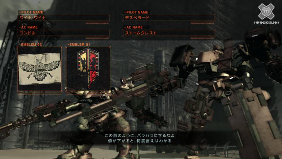 Come dicevo, il menu si divide in tre pagine distinte: oltre a quella principale dove infuria il conflitto, abbiamo a disposizione una sezione dedicata alla gestione della nostra squadra e relativi membri ed infine l'Officina, cuore pulsante del gioco. Qui possiamo creare il nostro AC comprando pezzi sempre migliori con l'avanzare della storia, andando così a creare varie tipologie differenti a seconda delle nostre esigenze e salvandole infine in uno degli slot a nostra disposizione. Ogni singola parte del nostro mezzo può essere sostituita, stando sempre ben attenti a rispettare due parametri fondamentali: il carico che possiamo trasportare e l'energia che il generatore ci mette a disposizione. Diventa quindi possibile creare ogni genere di diavoleria ci venga in mente, da un AC cecchino agile e veloce, arrivando ad un enorme mezzo cingolato capace di trasportare letali cannoni laser in grado di distruggere i nemici con un singolo colpo; in questo caso posso davvero dire che l'unico limite è la fantasia del giocatore. Come se non bastasse, dopo aver passato ore a modificare meccanica e armamenti del nostro AC, possiamo anche personalizzarlo esteticamente colorandone come più ci aggrada ogni singolo componente, tappezzandolo di emblemi o creando veri e propri design sfruttando i tantissimi strati a nostra disposizione. Per la gioia del designer che c'è in ognuno di noi.