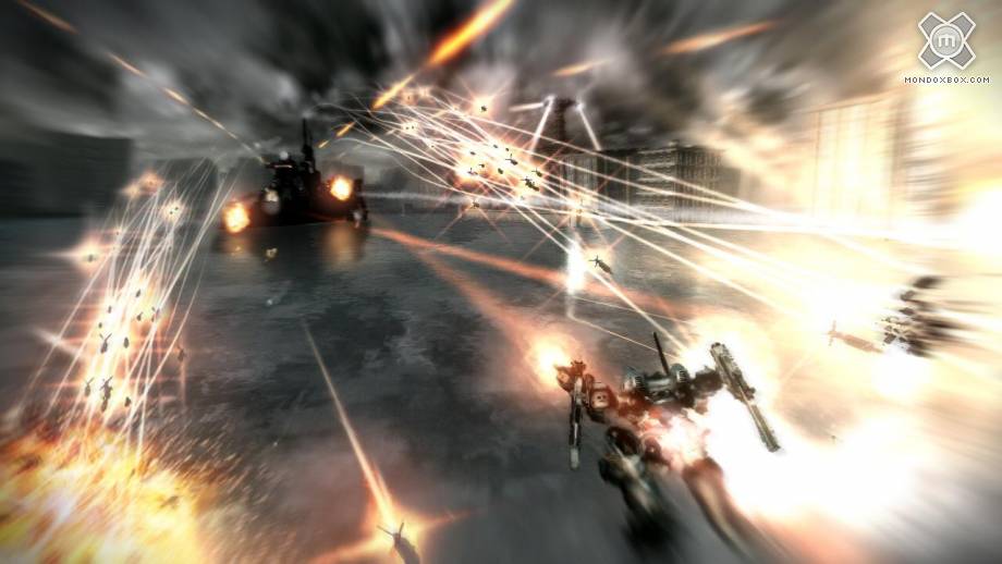 L' esperienza online non si ferma certo qui, visto che in ogni missione è possibile combattere con un nostro compagno o anche semplicemente ingaggiando un mercenario per darci manforte sia che si tratti della Storia che di una delle moltissime missioni Comando. Queste ultime sono scontri tendenzialmente più simili a ciò a cui ci aveva abituato la serie: combattimenti velocissimi contro un gruppo di nemici o scontri faccia a faccia con altri AC, uno o più a seconda della missione stessa, nei quali è fondamentale la preparazione del nostro mech; ad aiutarci in questo caso ci sono le schermate di briefing nelle quali veniamo a conoscenza del tipo di nemici, potendo così preparare un Armored Core ideale per scontarci con essi. Le missioni Storia presentano, finalmente, una struttura più corposa e solida, trasformandosi in vere e proprie macro-missioni dalla durata ragguardevole. Ovviamente l'obiettivo è sempre quello di sterminare i nostri nemici ma è la durata a sorprendere, nettamente superiore agli standard della serie. In questo caso veniamo lanciati nelle zone di guerra con vari obiettivi da compiere e sta al giocatore decidere in che modo farlo. Le aree a nostra disposizione sono generalmente piuttosto estese e liberamente esplorabili, dandoci così la possibilità di decidere l'approccio liberamente, senza alcun vincolo se non quello di sopravvivere; aspetto non sempre scontato, soprattutto per la durata e per la grande quantità di truppe nemiche che ci si oppongono. Ad aiutarci in questo caso interviene la presenza dei Garage, vere e proprie officine nelle quali possiamo riparare e ricaricare le nostre armi, ma anche sostituirle con altre più adatte al contesto. Questo è possibile utilizzando la Modalità Scansione, una particolare visuale che ci indica tutti i dettagli strategici della mappa e la posizione dei suddetti garage, ma anche la rotta da seguire, con il solo piccolo dettaglio che in questa modalità non abbiamo la possibilità di sparare. Naturalmente è anche possibile cimentarsi in scontri tra AC di altri giocatori, sfruttando la Battaglia Libera; questa, unita alla guerra globale della modalità Conquista, alle missioni Storia ed alle innumerevoli missioni Comando, fa sì che la longevità sia un problema completamente sconosciuto in Armored Core V.