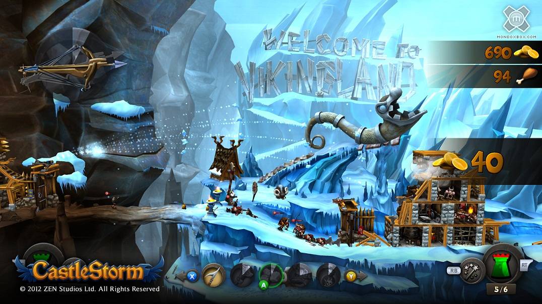 CastleStorm è uno di quei titoli più facili da giocare che da descrivere: ai lati di uno scenario 2D si trovano 2 castelli, uno nostro e uno del nemico, che si scontrano per la supremazia del territorio circostante. La battaglia vera e propria avviene su due livelli: a terra si scontrano le truppe, che partono dal proprio castello e avanzano fino a scontrarsi con i nemici allo scopo di farsi strada verso il fortino nemico, sfondare il cancello d’ingresso, conquistare la bandiera dell’esercito avversario e riportarla al proprio castello. Le truppe si creano esattamente come capita in molti altri RTS: quando la partita prende il via, il conteggio numerico del cibo a nostra disposizione inizia ad aumentare in maniera del tutto automatica, e quando si raggiunge la quantità necessaria a creare un’unità basta premere X e selezionare il tipo di soldato a cui dare vita (consumando ovviamente la quantità di cibo richiesta). Una volta creata, l’unità esce dal nostro castello e inizia a muoversi autonomamente verso il fortino nemico, fermandosi a combattere ogni qualvolta incontra un avversario sulla sua strada.Esistono 9 diversi tipi di combattenti per ognuna delle due fazioni (Regno e Nordici), ognuno con specifiche caratteristiche di attacco, energia vitale, velocità e quantità di cibo necessaria per la sua creazione: in base al cibo a disposizione in un determinato momento è quindi importante scegliere con accuratezza il tipo di soldato da creare e mandare in battaglia, perché facendo delle scelte sbagliate si rischia di rimanere senza combattenti a protezione del proprio castello nell’attesa di arrivare ad accumulare risorse sufficienti a creare nuove truppe. In sostanza i combattimenti a terra si svolgono in maniera del tutto automatica, visto che l’unico controllo che abbiamo sulle truppe è quello di scegliere quali creare e in che ordine farlo. Il motivo per cui non è necessario controllare direttamente i soldati è che per gran parte del tempo ci troveremo impegnati ad utilizzare la balista, ovvero un’antica macchina d’assedio in grado di lanciare a grande distanza oggetti e proiettili di vario tipo. La balista si trova sopra all’ingresso del nostro castello, ed il suo funzionamento nel gioco è in sostanza copiato da Angry Birds: basta infatti scegliere l’angolo di tiro e premere A per “sparare”. Esistono proiettili di vario tipo, ognuno con una potenza di attacco differente: semplici lance, grappoli di sassi in grado di colpire diversi bersagli contemporaneamente, bombe esplosive, pozioni magiche in grado di trasformare i nemici colpiti in tacchini, giganteschi martelli di Thor e persino pecore mosse da una propulsione posteriore del tutto naturale (sì, è proprio quello che pensate). Per lanciare i vari tipi di proiettile non serve accumulare alcun tipo di risorsa, ma è comunque necessario attendere il tempo di ricarica prima di poter lanciare un oggetto appena utilizzato, tenendo conto del fatto che ovviamente i proiettili più distruttivi hanno tempo di ricarica molto più alti.