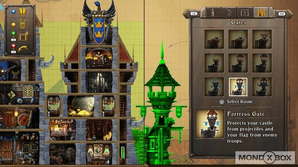 Gli slot per esercito, magie e proiettili sono limitati a 5, dunque prima dell’inizio di ogni battaglia è necessario scegliere 5 unità da portare con sé in battaglia, 5 incantesimi e 5 tipi di oggetti da lanciare. Man mano che si avanza nel gioco è possibile spendere l’oro guadagnato per migliorare le truppe, i tempi di ricarica di cibo, munizioni e magie, solidità del castello e via dicendo. In particolare, in CastleStorm il castello è un elemento ancor più importante di quello che si potrebbe pensare: esso è infatti completamente personalizzabile, sia a livello esteriore che nelle stanze che lo compongono. Ogni stanza ha una sua funzione, tra cui ad esempio la possibilità di creare una determinata unità, garantire tempi di ricarica migliori, permettere di ampliare le dimensioni dell’esercito, offrire oro bonus al termine della battaglia e molto altro. Quando una di queste stanze viene distrutta da un oggetto lanciato dalla balista avversaria, si perde il beneficio relativo: per questo motivo l’aspetto esteriore del castello non è un fattore solamente visivo. Attraverso l’editor è infatti possibile muovere le stanze a piacimento, potendo quindi ad esempio spostare le stanze che offrono le funzioni più importanti al piano terra, in modo che siano le ultime ad essere eventualmente distrutte e che quindi sia possibile usufruire dei benefici offerti da ognuna di esse per il maggior tempo possibile.