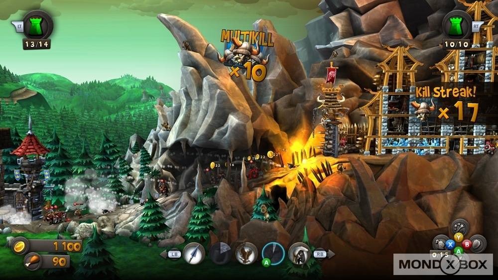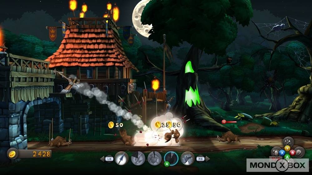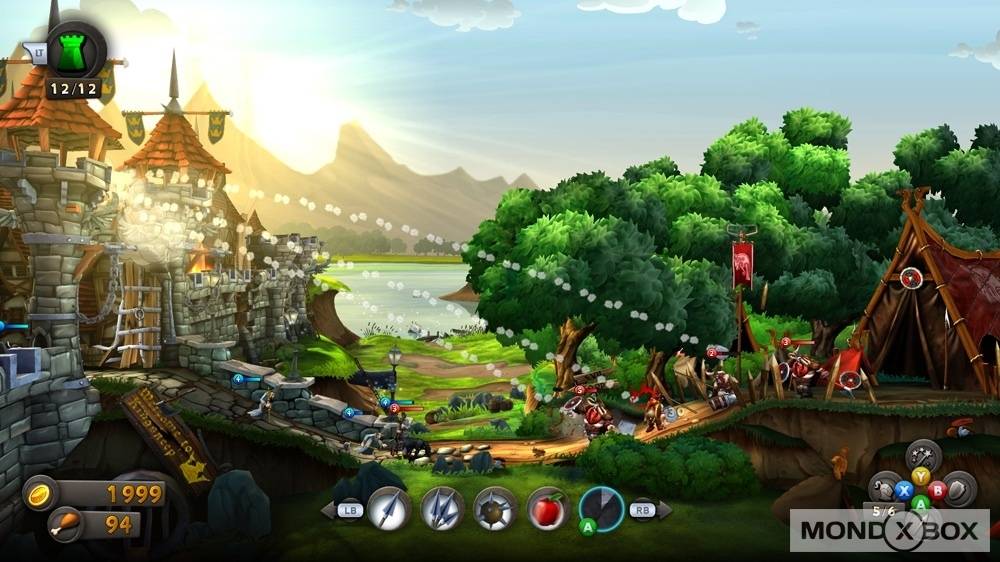 Questo è in pratica tutto quello che c’è da sapere sul gameplay di CastleStorm: potrebbe sembrare un’accozzaglia informe di diversi giochi, ma joypad alla mano funziona tutto decisamente bene e senza grosse difficoltà. La modalità di gioco principale è la Campagna, suddivisa in vari scenari di gioco da superare uno dopo l’altro per proseguire nella trama, con qualche intermezzo particolare come missioni in cui bisogna abbattere i tacchini che volano in cielo, vincere una battaglia senza poter usare l’esercito (quindi usando solo la balista) ed altre sfide decisamente originali, che aiutano a variegare un po’ il gameplay. Accanto alla Campagna, che è sicuramente la modalità principale, trovano posto le Partite Veloci (sotto il nome di Schermaglia), Sopravvivenza (in cui fermare ondate di nemici sempre più forti) e il Multiplayer, sia locale che tramite Xbox Live.