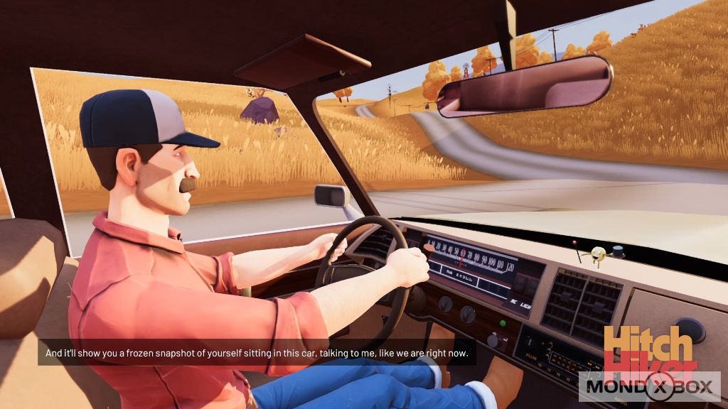 A differenza di classici del cinema con nomi simili, come Hitch-Hiker del 1953 o The Hitcher del 1986, in Hitchhiker dei tedeschi Mad About Panda non seguiamo la storia di un maniaco omicida che tormenta dei poveri automobilisti, tutt'altro. Il gioco ci pone da subito nei panni di un ragazzo sul sedile del passeggero di un pick-up nel sud degli Stati Uniti, tra strade in mezzo ai campi caratteristici di quella zona e il classico contadino texano al volante, con il quale facciamo due chiacchere. Qui possiamo guardarci intorno e interagire con l'autoradio, il finestrino e i tanti oggetti presenti in macchina. La nostra identità non è chiara nemmeno a noi stessi, ma ben presto diventa evidente che il conducente del mezzo sa qualcosa su di noi.