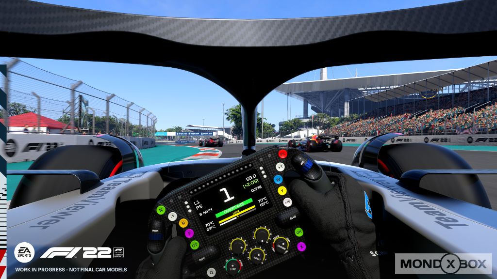 I modelli delle monoposto presenti in F1 22 appaiono sin da subito molto diversi rispetto al passato proprio per via delle nuove regolamentazioni introdotte dalla FIA, pensate per massimizzare l’importanza del cosiddetto “effetto-suolo”, e per la presenza dei nuovi pneumatici da 18” pollici. Si tratta di differenze sostanziali, che vanno a incidere sensibilmente sulla gestione dei flussi aerodinamici e che, come accade nella realtà, si riflettono sul comportamento in pista delle vetture. Per riprodurre al meglio le novità, gli sviluppatori hanno quindi deciso di implementare una simulazione fisica più accurata rispetto al passato e di creare un nuovo modello di simulazione del comportamento degli pneumatici, in grado di replicare in modo più verosimile le variazioni di temperatura e, di conseguenza, l’usura. Completamente assente invece l’effetto “porpoising”, altrimenti detto “rimbalzo aerodinamico”, praticamente sconosciuto fino a qualche mese fa e che quindi non è stato possibile implementare a dovere nel motore fisico. Pad (e volante) alla mano, F1 22 ha subito messo in mostra le differenze rispetto alle edizioni precedenti, con vetture più pesanti e decisamente meno agili in curva, ma allo stesso tempo meno soggette a subire gli effetti, specie quelli negativi, causati dalle vetture che ci precedono. Le monoposto appaiono inoltre molto più rigide sulle sospensioni rispetto all’edizione 2021, specie quando si passa sopra ad un avvallamento o si decide di sfruttare in maniera aggressiva un cordolo particolarmente sporgente. Il nuovo modello di gestione degli pneumatici rende inoltre più evidenti le differenze tra le varie mescole, specie dopo qualche giro di pista. Ora le diverse parti della gomma si scaldano in maniera diversa in base alle sollecitazioni e questo influisce in modo più marcato rispetto al passato sul consumo.