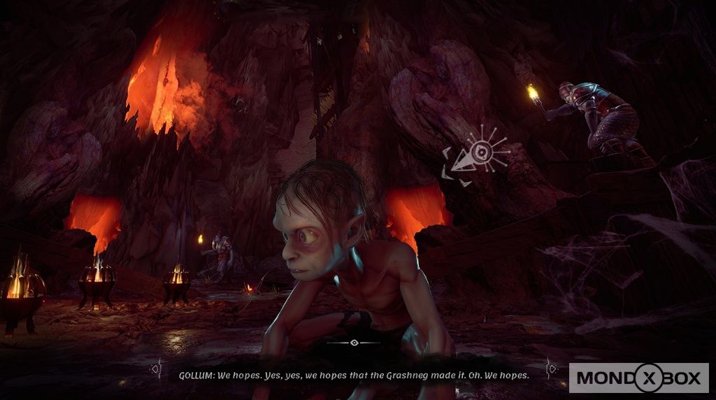 Il gioco infatti inizia con Gollum prigioniero nel Bosco Atro dopo essere stato catturato da Aragorn, dove viene interrogato da Gandalf su come sia riuscito a fuggire da Mordor e su dove sia il suo “tesoro”. Attraverso dei flashback abbiamo quindi modo di rivivere l’atroce periodo di schiavitù di Gollum e di come sia riuscito a sopravvivere e fuggire facendo ciò che gli riesce meglio, ovvero sfruttare la sua agilità, furtività e la capacità di manipolare con le menzogne le persone attorno a lui. Nel corso delle oltre quindici ore necessarie a completare il gioco, tuttavia, non visitiamo solo i campi di prigionia di Mordor, ma la storia prosegue anche dopo l’interrogatorio di Gandalf mostrandoci una parte totalmente inedita come l’alleanza con l’elfa ribelle Mell per scappare da Bosco Atro. Daedalic ha quindi sfruttato un collegamento con l’opera originale per narrarci uno sguardo più dettagliato ad una storia che già conoscevamo e per raccontare una trama totalmente nuova. Apprezzabile tuttavia come questa parte si riesca comunque ad incastrare bene senza stravolgere il “canone” del Signore degli Anelli, e gli sviluppatori si sono anche affidati alle associazioni degli studi tolkieniani proprio per essere sicuri di non andare a contraddire nessun punto dell’opera originale.