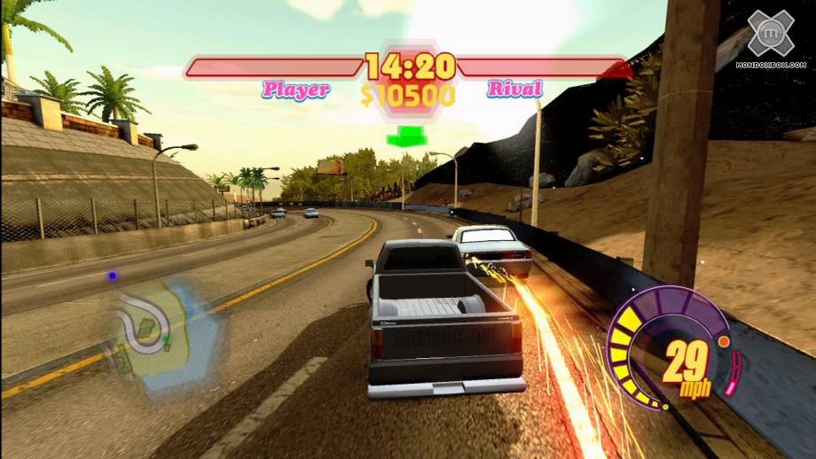 Sia la prima che la seconda modalità vedono come protagonista l’anonimo personaggio che impersoneremo per tutta la durata del gioco e che dovrà eseguire dei piccoli passi hip hop a fianco del proprio mezzo. La sfida si svolge dovendo premere a tempo i tasti elencati su di una barra posta in basso dello schermo, permettendo al nostro personaggio di eseguire in maniera corretta tutti i passi, sempre uguali e ripetitivi in tutte le sfide. Anche la modalità “Esibizione” consiste nel premere a tempo dei tasti per completare la sfida, ma questa volta lo faremo a bordo del nostro veicolo nell’intento di ammaliare la folla sfoggiando una carrozzeria fiammante e di tutto rispetto. Purtroppo a causa della scarsa originalità e varietà di queste sfide, molte volte si finisce nel preferire la prima modalità, ossia quella di vagare senza meta per le strade della città provocando continui incidenti. L’unica occasione offerta dal gioco per evitare di ripetere sempre le stesse cose è quella di andare alla ricerca di monete segrete o di suppellettili cittadini, quali cartelloni o parchimetri da distruggere. Completando questi obiettivi secondari, si otterranno ulteriori bonus monetari e potremo sbloccare alcuni obiettivi del gioco.