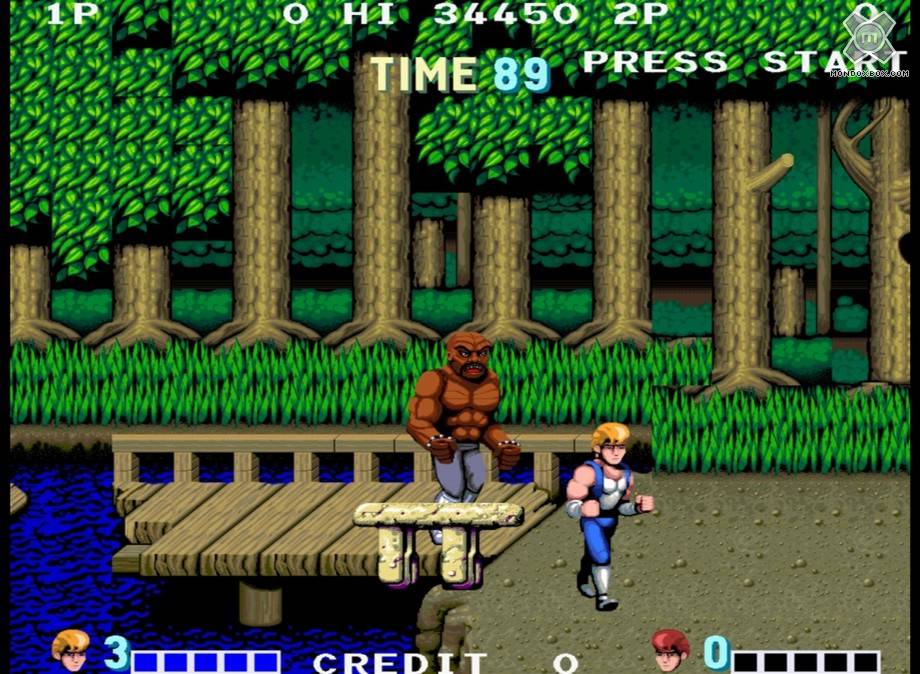 Fondamentalmente la trama di Double Dragon è tanto risicata quanto banale: i Black Warriors, che poi sarebbero i classici cattivoni di turno, per qualche oscuro motivo un bel giorno decidono di rapire la bella Marian, fidanzata del biondo Billy. Insomma, 20 anni fa ce ne importava poco della trama di un gioco a dire la verità, ci accontentavamo di quel mucchio di pixel che facevano del loro meglio per somigliare a degli eroi e ci stupivamo quando prendevamo a sprangate il sosia di Mister T. Tornando alla descrizione del titolo, come da tradizione saremo noi a doverci fare giustizia da soli o al massimo in compagnia di un amico (che andrà ad utilizzare il caro fratello Jimmy), lungo una metropoli, passando per una fabbrica abbandonata e un bosco fino ad arrivare al quartier generale dei cattivi; detto in poche parole soltanto quattro scenari (corti) per arrivare alla resa dei conti con il malvagio Shadow Boss (nome originale) con tanto di fondale abbellito dalla fidanzata di Billy appesa al muro come un salame e successivo ed inspiegabile (ed inspiegato ancora oggi dopo 20 anni) colpo di scena dopo la vittoria contro il boss se giocate in due.