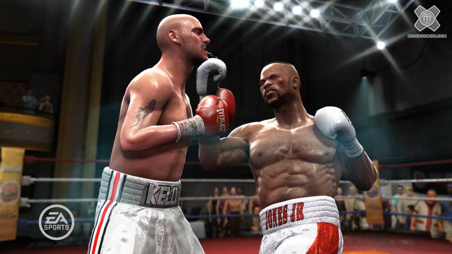 - Uno degli aspetti che colpisce maggiormente di Fight Night Round 4 è senza dubbio quello tecnico. Nulla è stato lasciato al caso in questa produzione, e qualsiasi poligono compaia sullo schermo di gioco vanta un ottimo livello di dettaglio; tuttavia ciò che lascia del tutto interdetti è la cura prestata nella modellazione ed animazione dei pugili, semplicemente perfetti in tutto e per tutto. Durante i vari match è impossibile non restare basiti alla vista delle fibre dei vari gruppi muscolari degli atleti, delle venature sulle loro spalle, delle gocce di sudore che ne percorrono i volti e i corpi, o delle stupende animazioni, maggiormente apprezzabili durante gli spettacolari replay dei vari KO: il realismo con il quale, dopo un violento gancio alla testa, il collo si torce e poi ritorna nella posizione originaria e gli effetti che l’onda d’urto del pugno producono sui tessuti facciali del pugile di turno, lasciano sempre a bocca aperta.Anche dettagli apparentemente marginali come l’espressività degli occhi degli atleti prima, dopo e durante gli incontri sono stati curati con la massima attenzione e il risultato è che ci si trova ad ammirare dei soggetti apparentemente vivi, reali, non dei fantocci. E in un simile tripudio visivo trova spazio un sistema di rilevamento delle collisioni allo stato dell’arte, che scongiura completamente il rischio di fastidiose compenetrazioni di poligoni. Se tutto ciò non bastasse a darvi un’idea della bontà del comparto tecnico di Fight Night Round 4, aggiungiamo che il motore grafico riesce a gestire visivamente i danni che i combattenti si procurano nel corso dei match, con lividi, escoriazioni e tagli che si aprono sui loro volti.