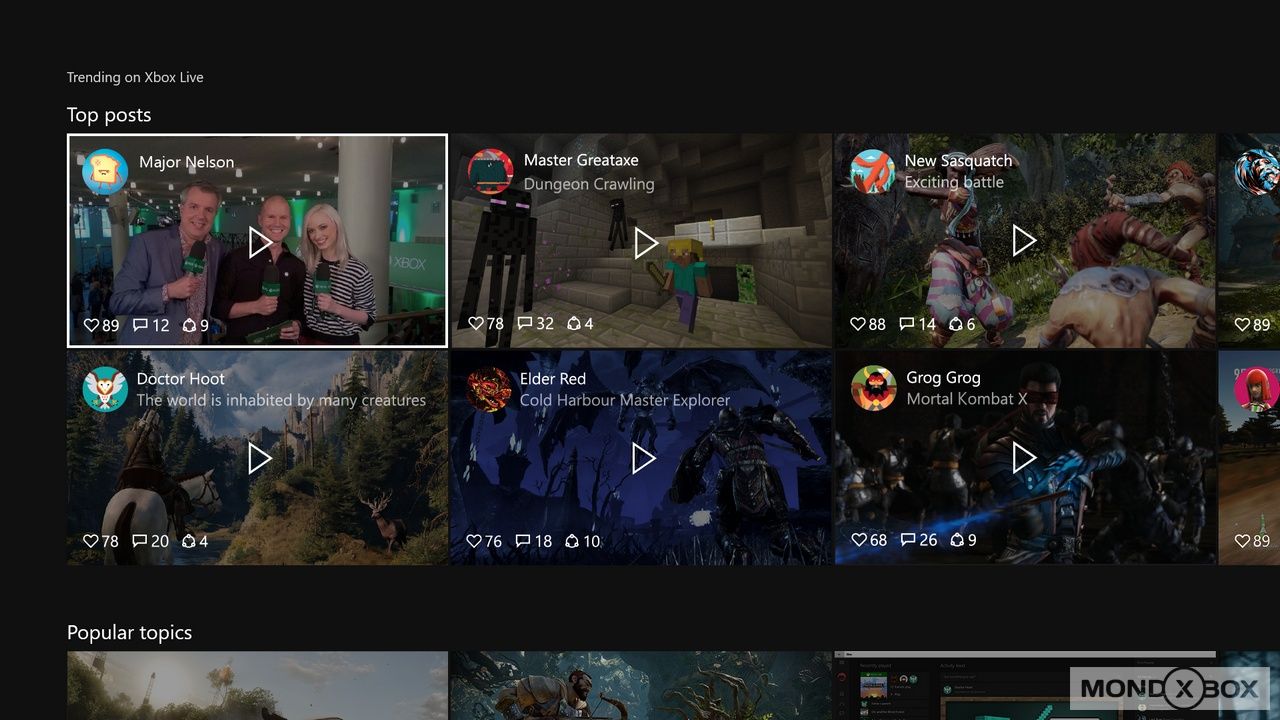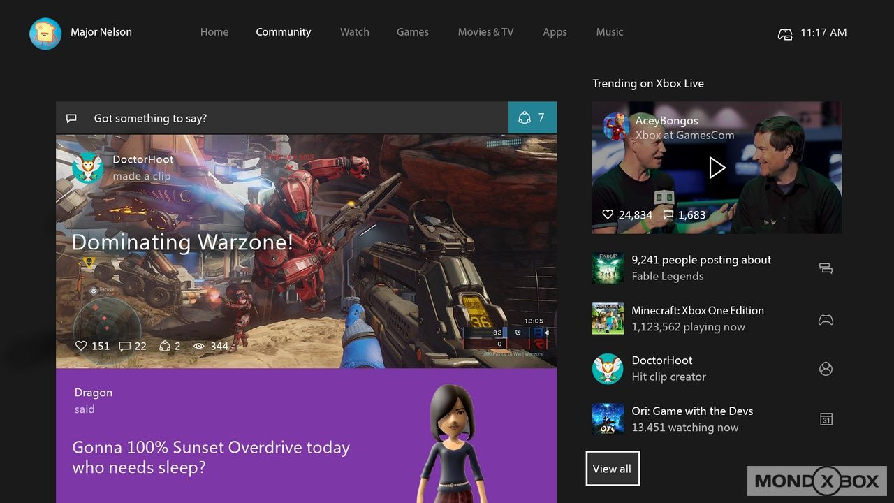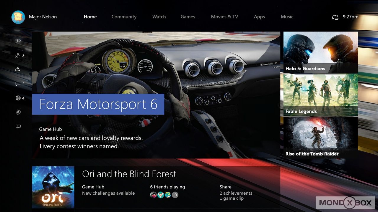 I tab sono aumentati portando Film, Musica e TV in primo piano facilitando la scoperta di nuovi contenuti nelle rispettive sezioni. La navigazione è fluida e veloce, permettendo di arrivare rapidamente a quello che si cerca oltre che a scoprire la disponibilità di nuovi contenuti nelle varie sezioni. Durante la presentazione, i ragazzi del team si sono poi soffermati sul nuovo tab Community che permetterà di scoprire rapidamente cosa ha da offrire l'enorme comunità di giocatori Xbox, con un nuovo aspetto che sulla colonna centrale mostra i contenuti provenienti dai nostri amici e a sinistra quelli provenienti dalla console. Per la prima volta Microsoft userà algoritmi di selezione dei contenuti, che permetteranno di evidenziare i contenuti più trendy concedendogli un posto più in alto nella lista.
