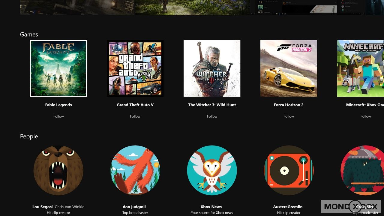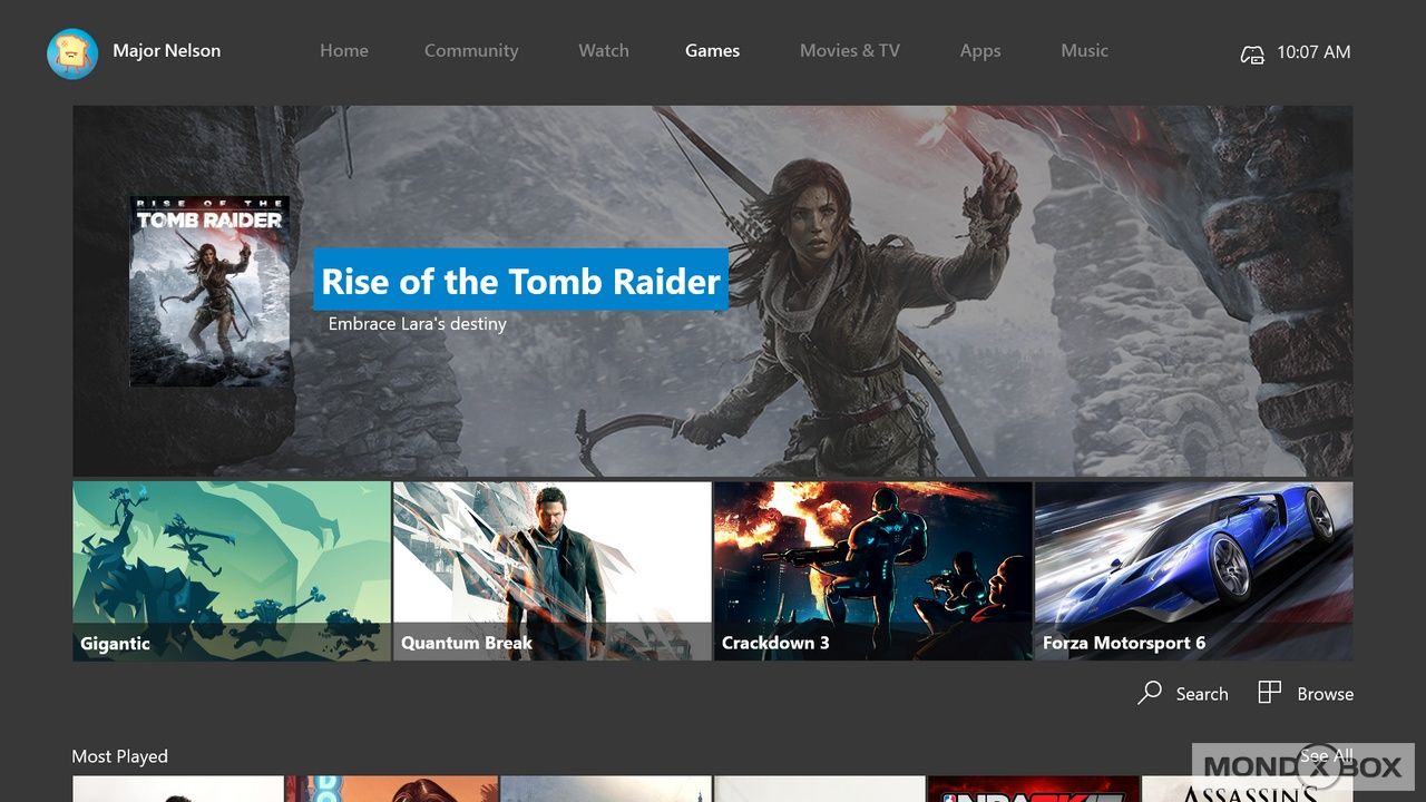 I tab sono aumentati e rappresentano ognuno una categoria di contenuti che, qui la prima novità, è possibile sfogliare in verticale nelle sue articolazioni. Ad esempio il tab Home contiene in primo piano, con un'immagine che occupa quasi tutto lo schermo, l'ultima attività che avete effettuato (come nell'attuale console), ma invece di sfogliare a destra o dover andare in "I miei giochi ed App", scrollando in verticale è possibile andare sulle ultime attività, i propri item messi tra i favoriti ed il feed degli amici. Lo scroll verticale è veloce ed immediato, ma Microsoft non si è fermata a questo: utilizzando i dorsali della controller è possibile saltare di sezione in sezione velocizzando ulteriormente lo scrolling.
